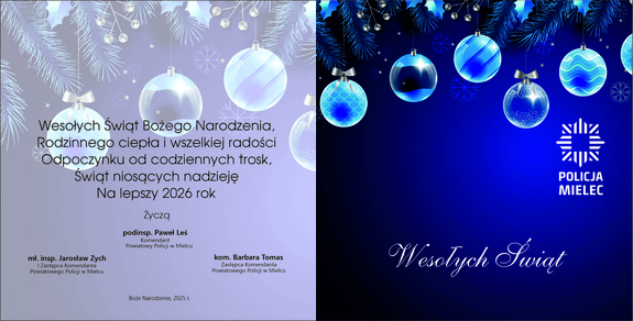 Z okazji Świąt Bożego Narodzenia Komendant Powiatowy Policji w Mielcu podinsp. Paweł Leś wraz z kadrą kierowniczą, policjantkami, policjantami i pracownikami Policji, składa mieszkańcom powiatu mieleckiego najserdeczniejsze życzenia zdrowia, szczęścia i pomyślności. Niech świąteczny czas upływa Państwu w atmosferze radości i bezpieczeństwa.