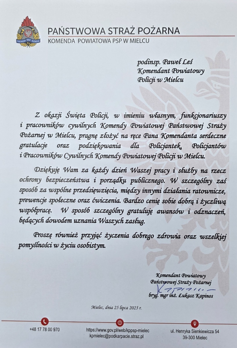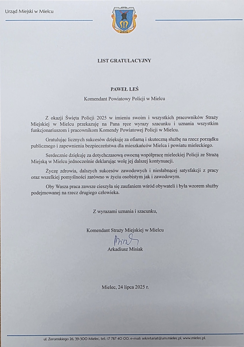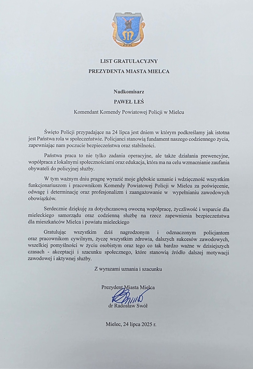 Z okazji obchodów Święta Policji w Komendzie Powiatowej Policji w Mielcu na ręce Komendanta Powiatowego zostały skierowane życzenia, podziękowania i gratulacje dla Policjantek Policjantów oraz pracowników Policji od przedstawicieli władz rządowych, samorządowych oraz instytucji, z którymi współpracują mundurowi. Publikujemy treści wszystkich listów.