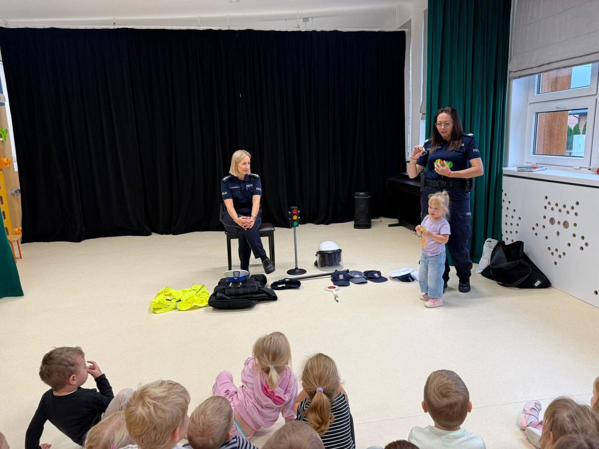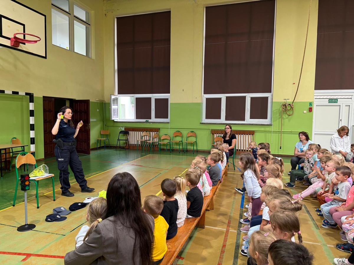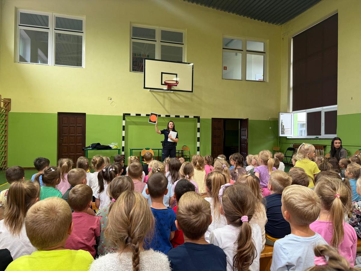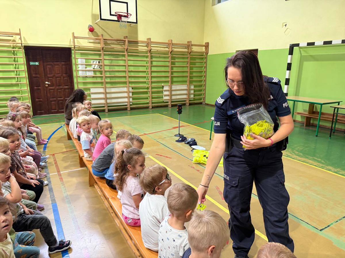 - rozmowa o odblaskach: duży nacisk położono na znaczenie elementów odblaskowych. Policjanci tłumaczyli i pokazywali, jak niewielki odblask przy plecaku lub na rękawie może uratować życie, czyniąc dziecko widocznym dla kierowcy z dużej odległości.