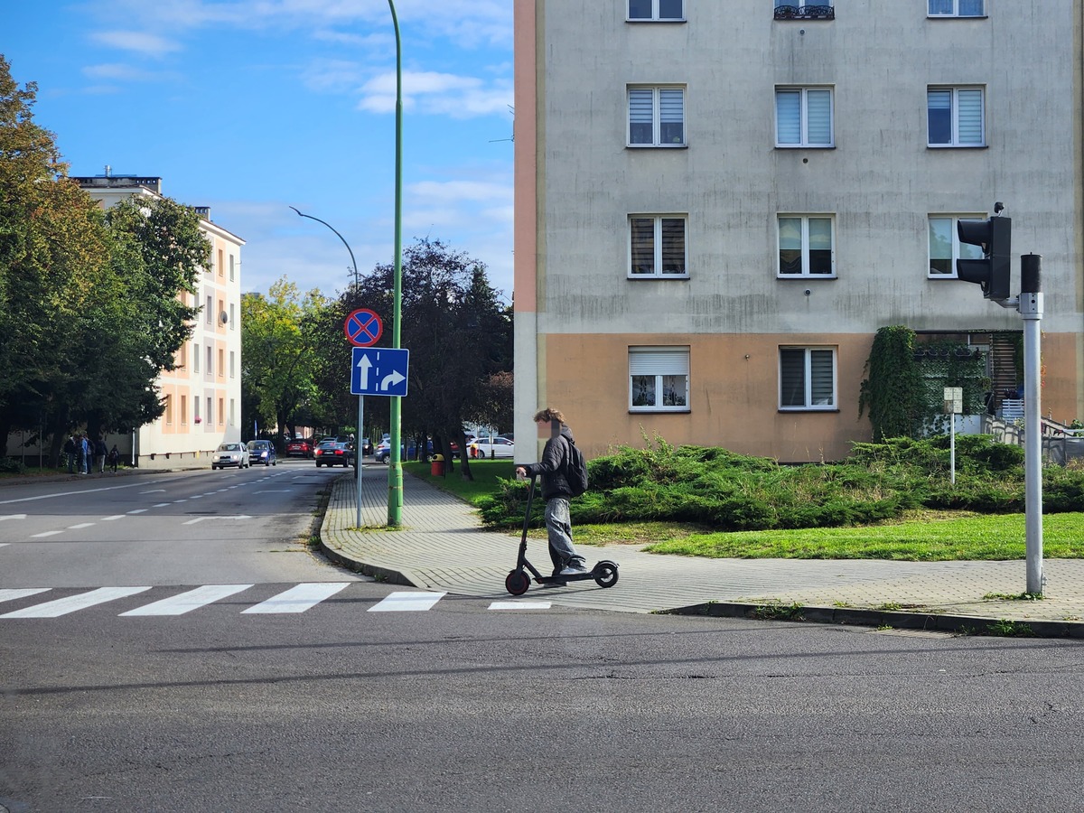 - przejeżdżanie przez przejście dla pieszych – kierujący hulajnogą ma obowiązek zejść z niej i przeprowadzić przez „pasy”,