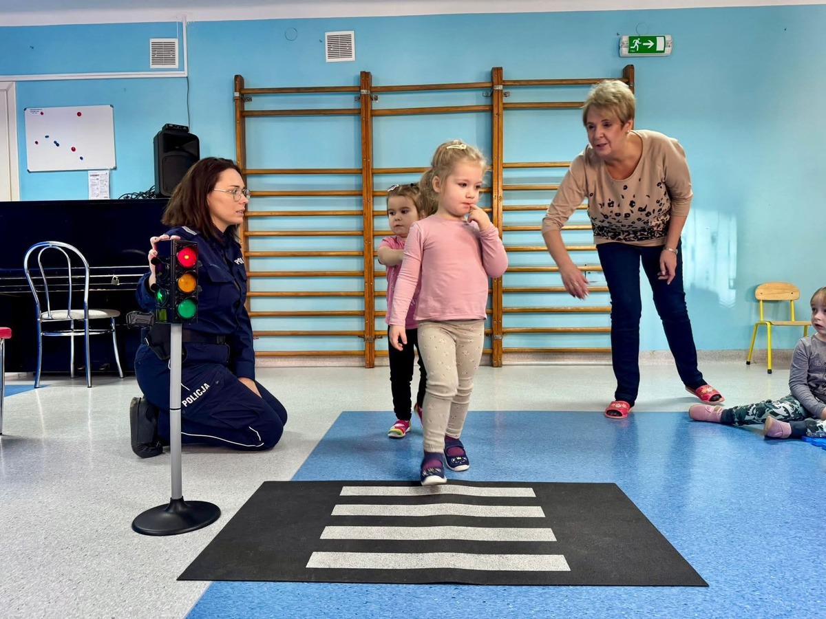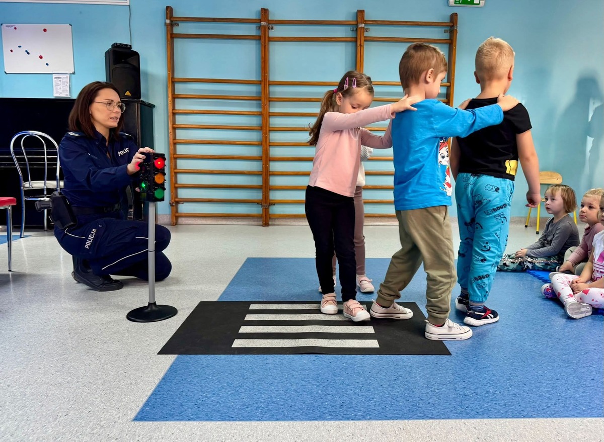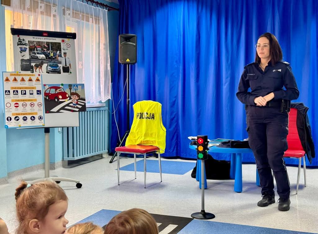 Podczas spotkania mundurowa w przystępny i atrakcyjny sposób przekazała dzieciom najistotniejsze informacje dotyczące ich bezpieczeństwa w różnych sytuacjach. Głównym tematem były zasady ruchu drogowego. Sierż. Szt. Nowak dokładnie wytłumaczyła, a następnie wspólnie z dziećmi przećwiczyła, jak prawidłowo przechodzić przez jezdnię, co oznaczają kolory na sygnalizatorze oraz dlaczego tak ważne jest noszenie odblasków, zwłaszcza po zmroku.