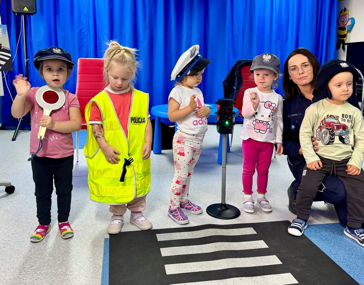 Maluchy z ogromnym zaangażowaniem uczestniczyły w spotkaniu, zadawały mnóstwo pytań i chętnie dzieliły się swoimi spostrzeżeniami. Największą radość wzbudziła możliwość zobaczenia z bliska policyjnego wyposażenia i mobilnego miasteczka ruchu drogowego. Przedszkolaki chętnie przechodziły przez przejście dla pieszych, obserwując zmieniające się kolory na sygnalizatorze świetlnym. Ponadto dzieci mogły przymierzyć czapkę, obejrzeć kajdanki czy lizak policyjny, co było dla nich nie tylko fantastyczną atrakcją, ale także okazją do oswojenia się z wizerunkiem funkcjonariusza.