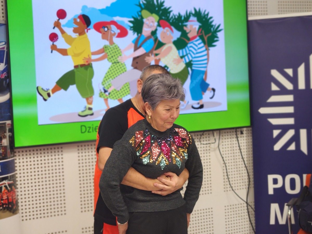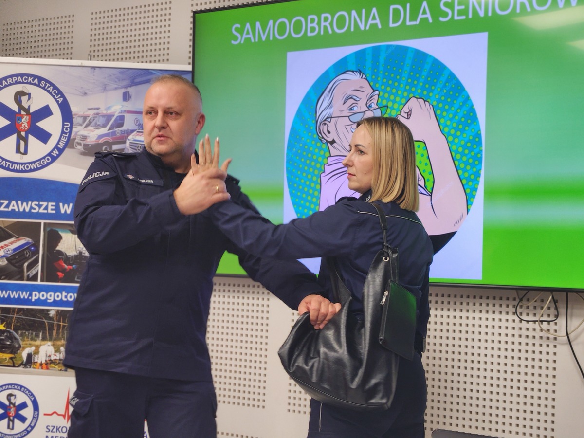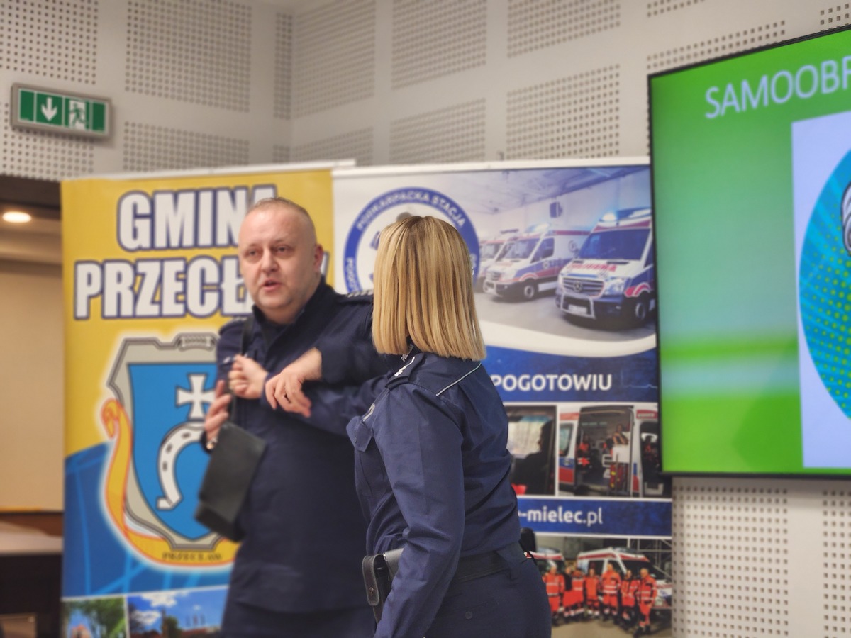 Równie dużym zainteresowaniem cieszyły się warsztaty z samoobrony, które poprowadził policyjny instruktor taktyk i technik interwencji – asp. szt. Łukasz Wrażeń. W trakcie zajęć teoretyczno-praktycznych wyjaśnił on seniorom podstawowe zasady skutecznej ochrony osobistej. Uczestnicy uczyli się, jak w bezpieczny i prosty sposób uwolnić się z chwytu lub jak zablokować atak, co dostarczyło im niezbędnej wiedzy i pewności siebie w kontekście potencjalnego zagrożenia.