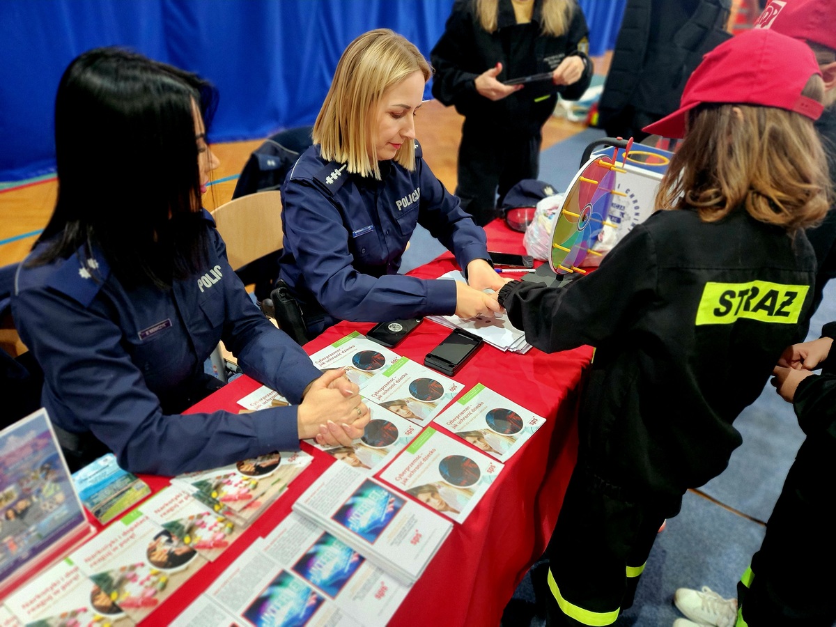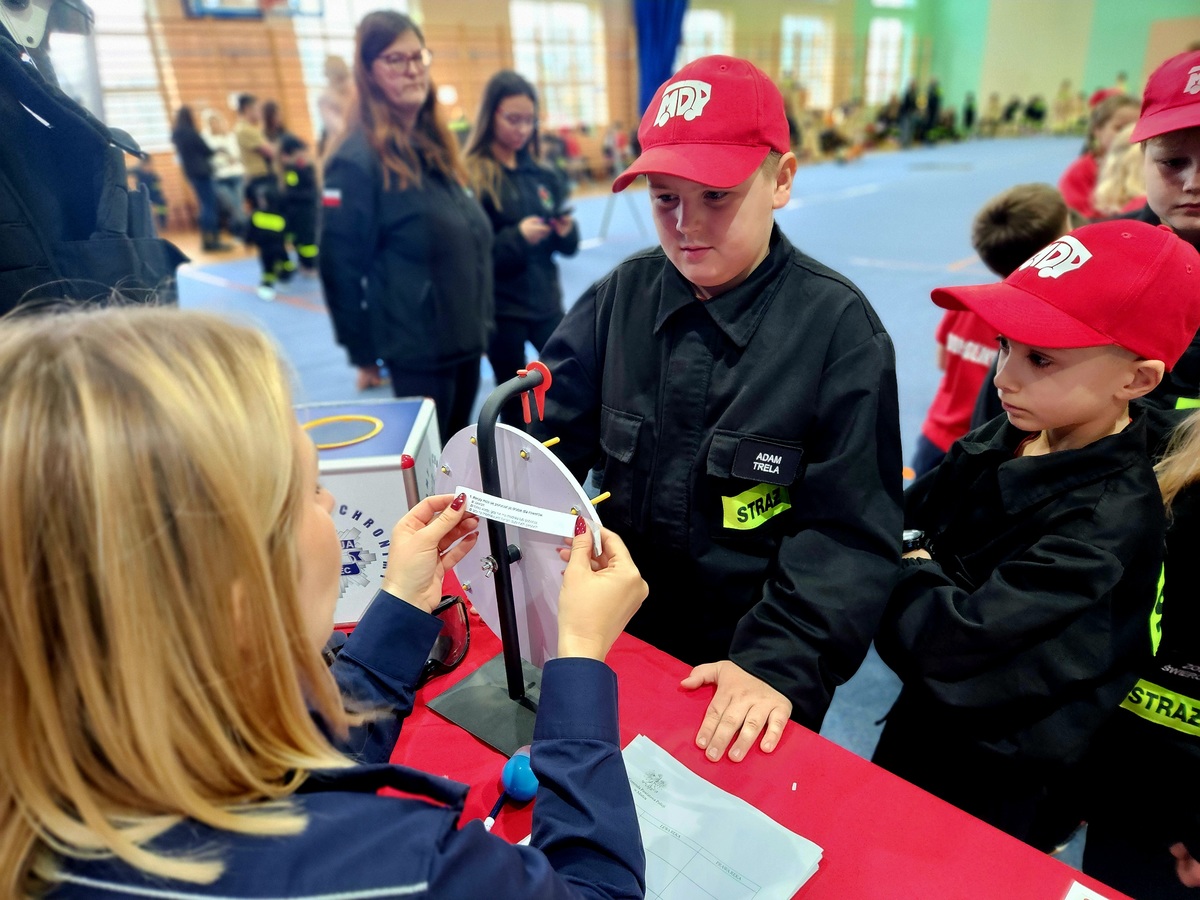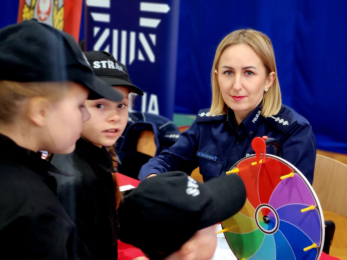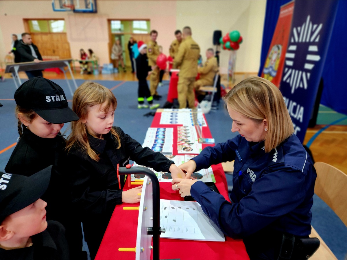 Funkcjonariuszki prowadziły dla młodych uczestników oraz kibiców szereg interaktywnych konkursów i zabaw związanych z szeroko pojętym bezpieczenstwem. Dzieci miały okazję sprawdzić swoją wiedzę i spostrzegawczość w quizach o bezpieczeństwie, uczestniczyć w zabawach zręcznościowych oraz wziąć udział w „policyjnych” konkurencjach dostosowanych do ich wieku. Te chwile wspólnej rozrywki były doskonałą okazją, aby w luźnej, przyjaznej atmosferze przypomnieć najmłodszym o podstawowych zasadach bezpieczeństwa – zarówno na drodze, podczas zimowego wypoczynku, jak i w kontaktach z obcymi.